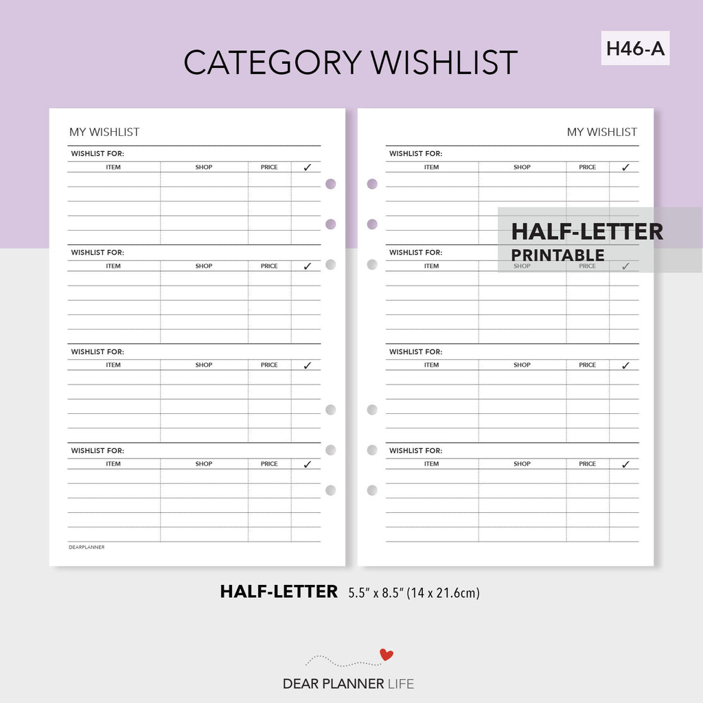 Category Wishlist printable - Half Letter size